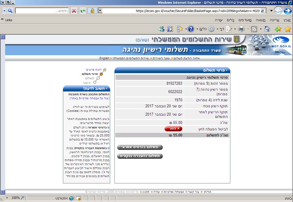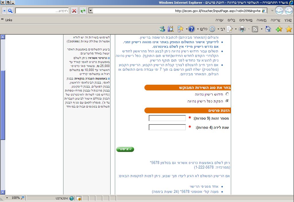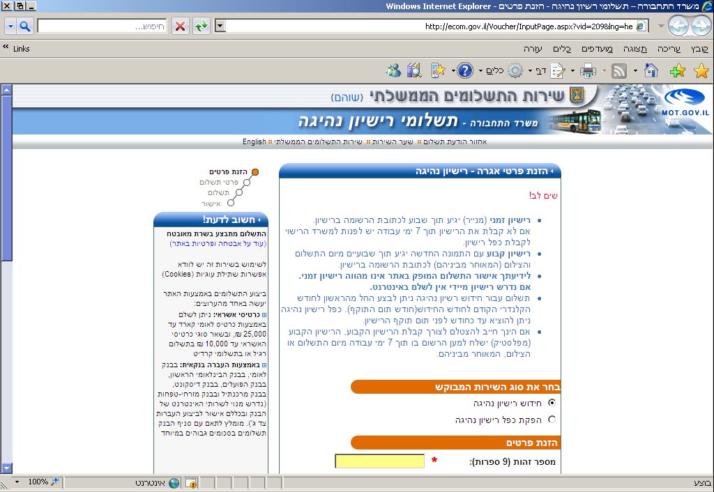 ישראלי? נכנסים לפורטל שער הממשלה בוחרים בצד שמאל "תשלומים". מקבלים את הקישור הזה: http://www.gov.il/firstgov/ecom בוחרים "חידוש רשיונות נהיגה"